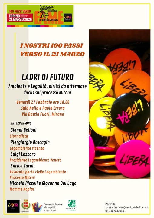 “Ladri di futuro” è il titolo dell’iniziativa promossa dal Presidio Libera del Miranese, in collaborazione con Legambiente del Miranese e il Centro per la Pace e la Legalità "Sonia Slavik" di Mirano.Un momento di approfondimento e confronto dedicato al tema delle ecomafie e alla difesa dei beni comuni, con un focus particolare sul processo Miteni, una delle vicende più gravi di inquinamento da PFAS che ha colpito il Veneto e segnato profondamente intere comunità.Parlare del processo Miteni significa parlare di responsabilità, di tutela della salute pubblica, di diritto all’acqua pulita e di giustizia ambientale. Significa anche riflettere su cosa accade quando l’interesse economico prevale sulla protezione dell’ambiente e sul futuro delle nuove generazioni.“Ladri di futuro” vuole essere uno spazio di consapevolezza e impegno civile: perché difendere l’ambiente significa difendere i diritti, la legalità e la dignità delle persone. Un’occasione per informarsi, capire e ribadire che la lotta contro i reati ambientali riguarda tutti noi. -