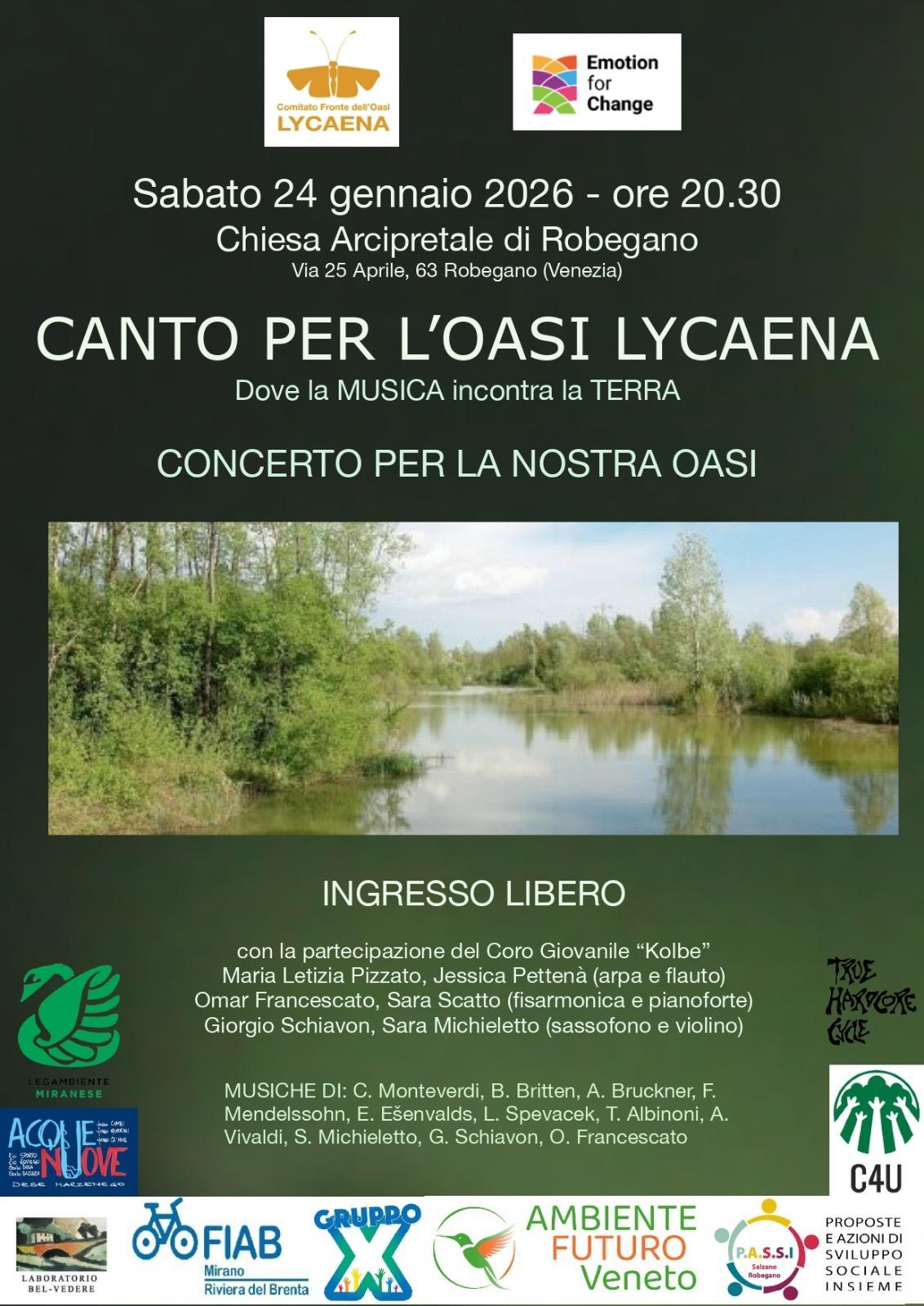Le emozioni della musica, le emozioni della natura. Una serata insieme per prender coscienza del valore di quegli scrigni di natura che abbiamo nel nostro territorio e di come questi vadano tutelati da attività incompatibili.Sabato 24 gennaio, ore 20.30. Chiesa dei SS Giacomo e Cristoforo, Robegano (VE).CANTO PER L'OASI LYCAENAMusiche classiche e brani originali composti dagli stessi musicisti del Emotion For Change . Un evento promosso dal Comitato Fronte dell'Oasi Lycaena insieme ad Ambiente Futuro Veneto ed altre associazioni: Circolo Legambiente del Miranese , Gruppo X , ACQUE NOVE associazione politico culturale , Bel-Vedere LAB 25 , FIAB Mirano - Riviera del Brenta , C4U - Salzano , ASD True Hardcore Cycle e PASSI Proposte e Azioni di Sviluppo Sociale Insieme