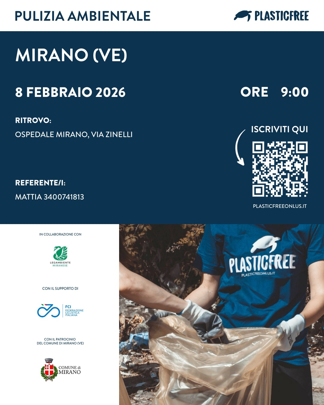 In collaborazione con PlasticFree Mirano e con il patrocinio del Comune di Mirano organizziamo questa raccolta rifiuti a Mirano, DOMENICA 8 FEBBRAIO, con ritrovo al park Ospedale Mirano lato entrata nuova su via Zinelli, dalle 9 alle 12.