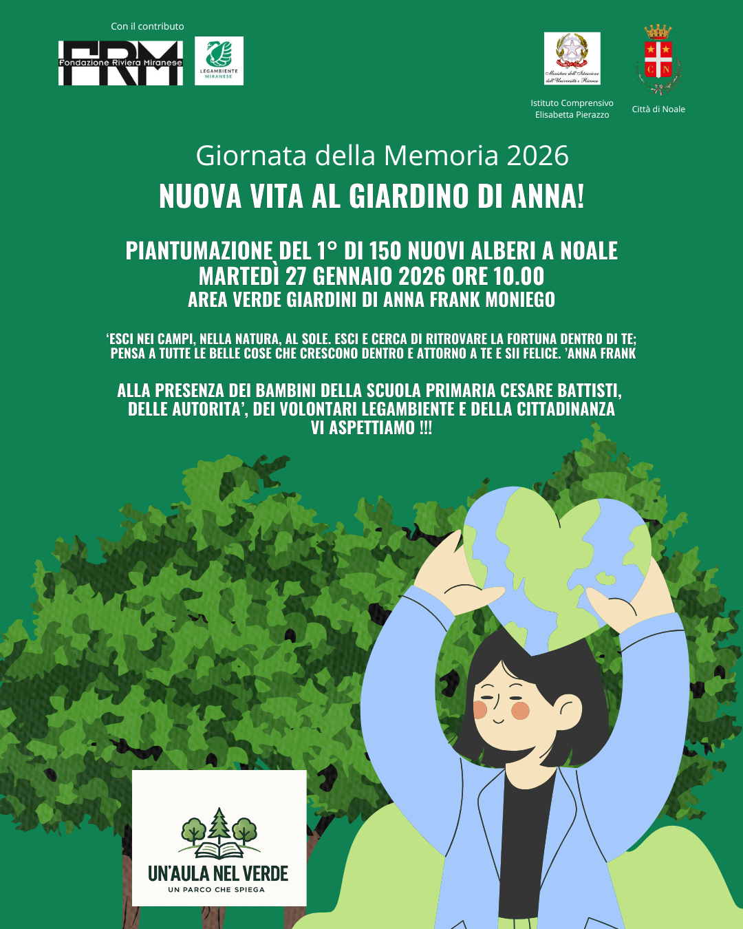 Martedì 27 gennaio celebreremo la Giornata della Memoria nei giardini del Parco A. Frank a Moniego, dando avvio all'apertura del progetto “Un’Aula nel Verde. Un Parco che spiega" cofinanziato da Fondazione Riviera Miranese in collaborazione con il Comune di Noale, assessorato all'ambiente.