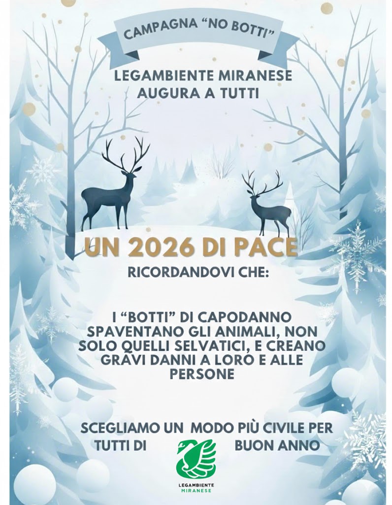 Volentieri replichiamo e diffondiamo anche nel territorio miranese il comunicato stampa diffuso il 27 dai colleghi del Circolo Legambiente di Venezia ricordando che nell'Unione dei Comuni (Mirano, Noale, Salzano e Martellago) dell'area miranese sono in vigore ordinanze che vietano l'uso di fuochi d'artificio.Venezia, 27 dicembre 2025 – In vista del Capodanno e delle festività in arrivo, il Circolo Legambiente di Venezia propone una celebrazione alternativa ai tradizionali fuochi d’artificio, con un occhio alla salute dei cittadini, alla salvaguardia degli animali ed alla tutela dell’ambiente.I fuochi pirotecnici contribuiscono all’aumento delle polveri sottili (PM10 e PM2.5), già critiche in città durante i mesi invernali, e creano forte disagio alla fauna selvatica e agli animali domestici. L’inquinamento atmosferico ha effetti gravi sulla salute, in particolare su bambini, anziani e soggetti fragili. Tanto più questa criticità è evidente, se pensiamo che la nostra città si colloca allo sbocco della pianura padana, che da sempre costituisce l’area più drammaticamente esposta dell’intero paese all’inquinamento atmosferico.Per questo, Legambiente invita l’Amministrazione comunale a considerare soluzioni sostenibili, come gli spettacoli con droni illuminati a LED, che garantiscono scenari spettacolari senza emissioni nocive e rumore eccessivo. Già altre amministrazioni, in Veneto, stanno sperimentando e sperimenteranno con questo capodanno spettacoli alternativi, davvero a bassissimo impatto ambientale, che devono essere mutuati anche nella nostra città.Venezia promuovendo eventi pubblici rispettosi dell’ambiente e della comunità potrebbe diventare un esempio di innovazione, perché è possibile garantire lo svago delle persone assicurando la piena sostenibilità ambientale.
